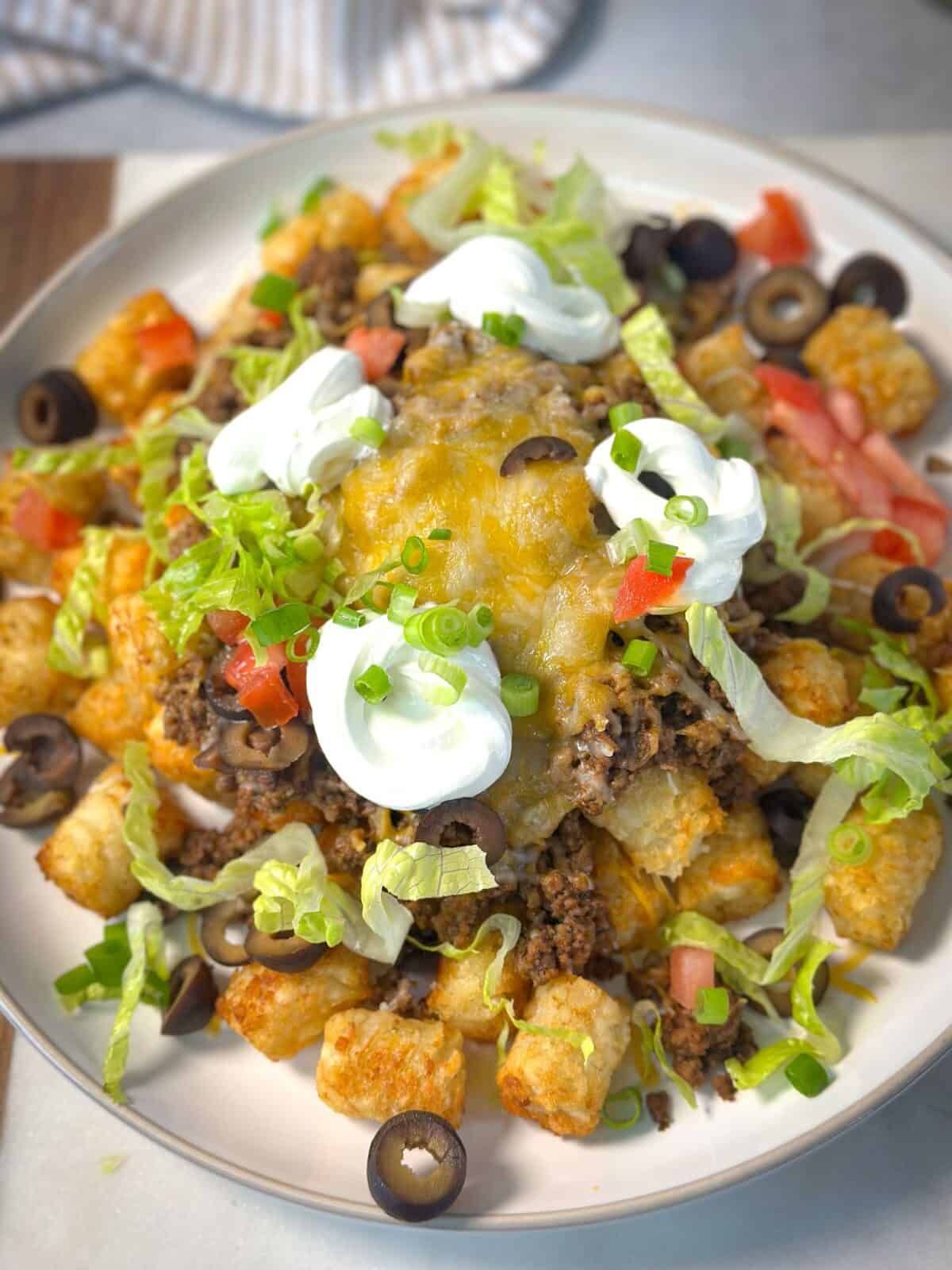 To assemble like a casserole-style, spread the baked tater tots evenly in a baking dish. Top with the taco beef mixture, then sprinkle with shredded Mexican cheese.