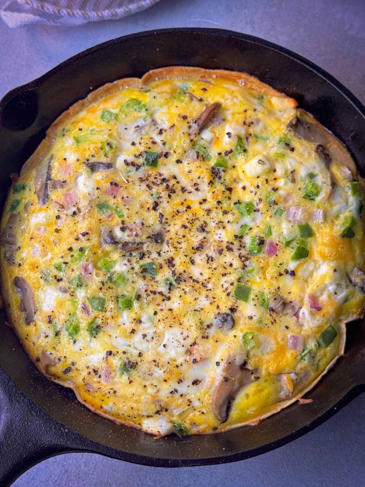 - Add the eggs, cottage cheese, peppers, onions, mushrooms, shredded cheese, salt, and pepper directly into the tortilla shell. Whisk gently in the pan to combine everything together.