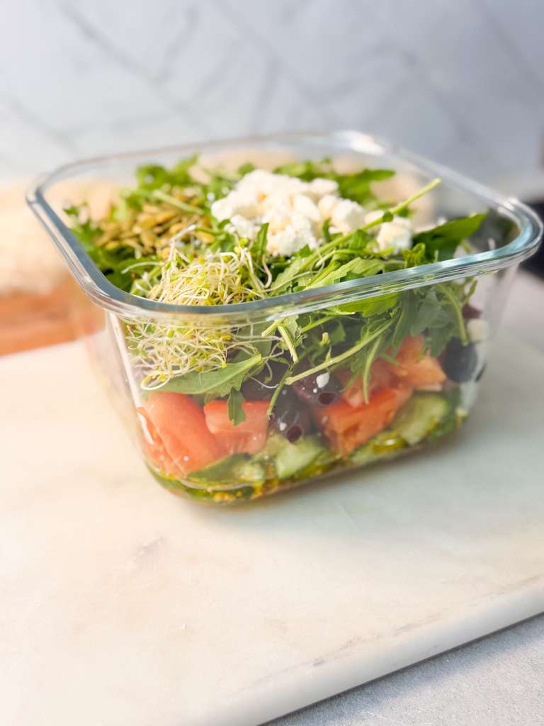 - When ready to eat, shake the container well or pour into a bowl and toss. Enjoy a perfectly dressed,non-soggy salad.